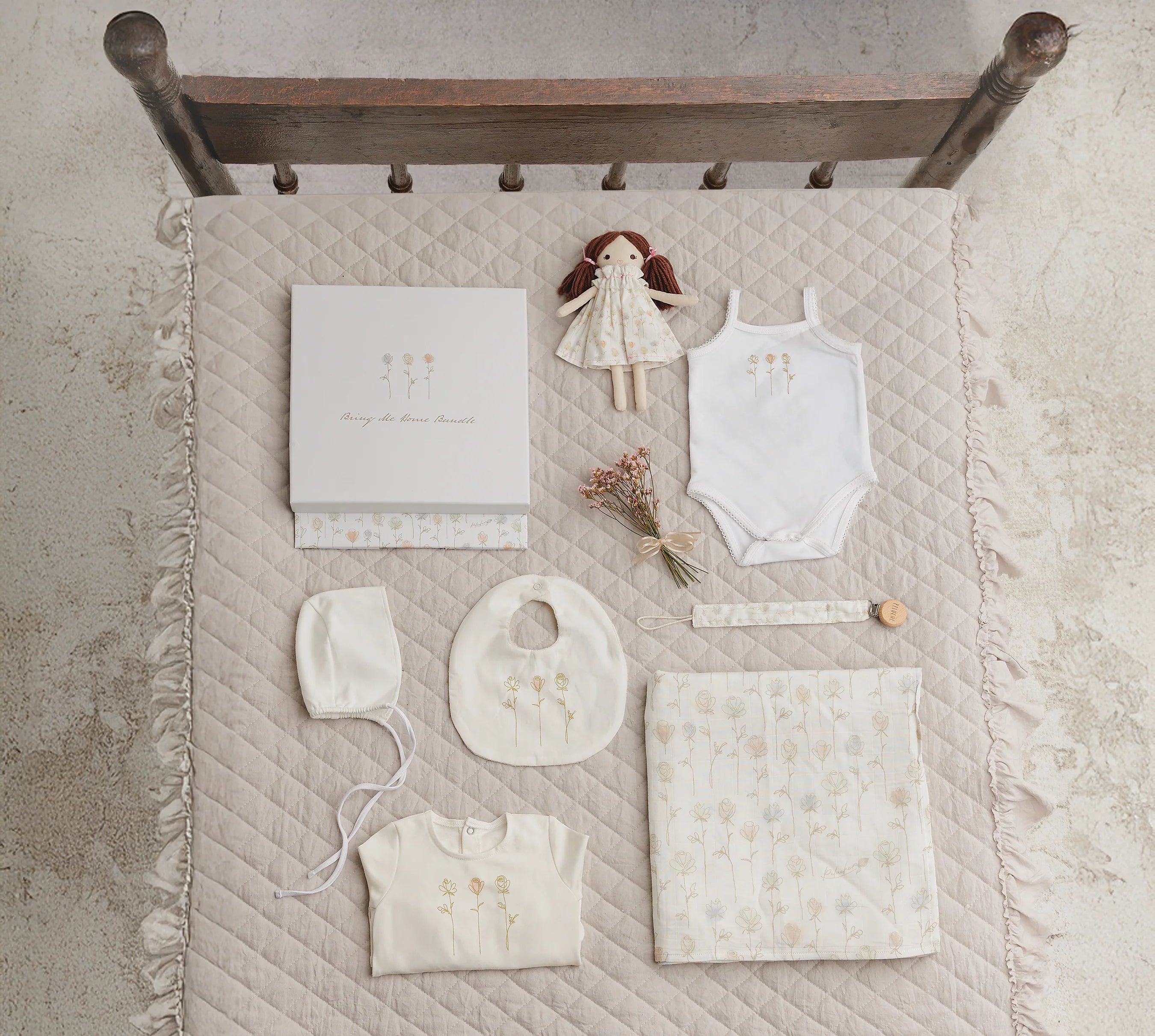 Footie, Bonnet, Swaddle, Paci Clip, Bib, Onesie & Ragdoll